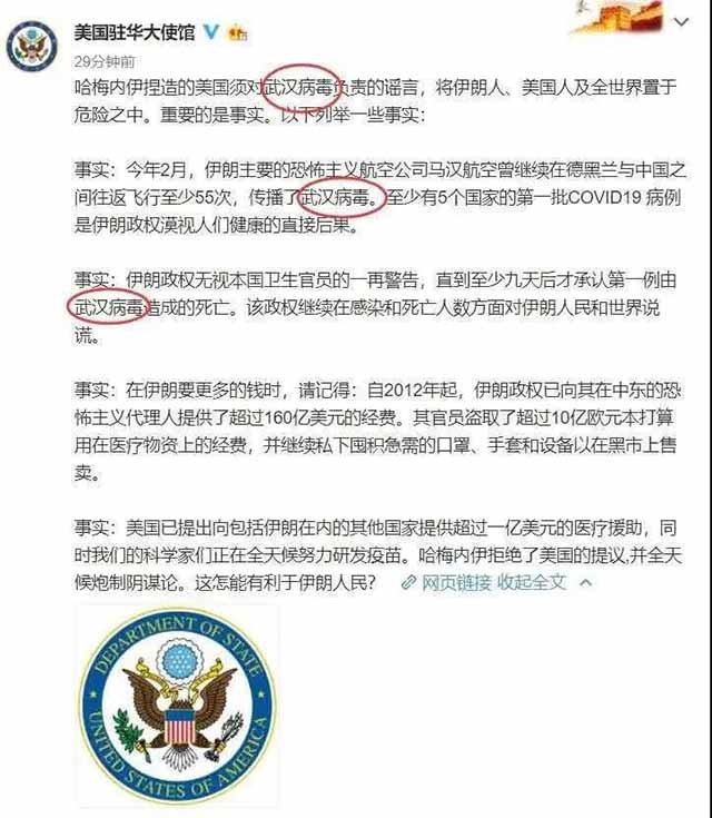 更具挑衅意味的是,美国驻华大使馆官方微博,在中国的网络平台上,连续发送两条微博,都带有“武汉病毒”字样。