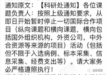 另一家医院发布了类似通知:按照上级通知要求,从即日开始暂停一切国际合作项目(纵向课题和横向课题,横向包括国外组织机构、外资公司、中外合作资源等来源项目)活动(包括但不限于入选病例、标本采集、信息采集、经费支出 等),请大家务必严格遵照执行。