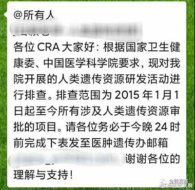 几乎与此同时,另一条消息热传:各大医院正在排查人类遗传资源研发项目。