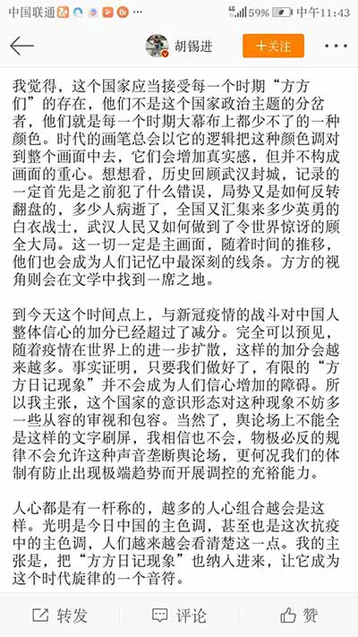 这还不是胡编要表达的真正重点,最重点是这句:“中国是强大的,不会因为一本方方日记在西方的出版真就怎么样了。从长远看,中国社会需要能够承受多元化所意味的各种代价。”