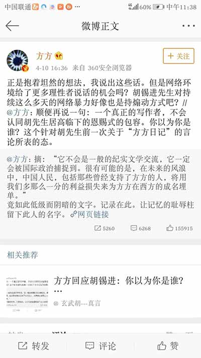 对方方日记,胡编的态度是很明确的。胡编3月19日发表长微博,用了很长的篇幅,以及胡氏特有的表述方式,让人感觉不到他要表达的重点是什么。其实,重点就是下面这几句话,我挑出来,并且用逻辑串接一下,意思就很明显了: