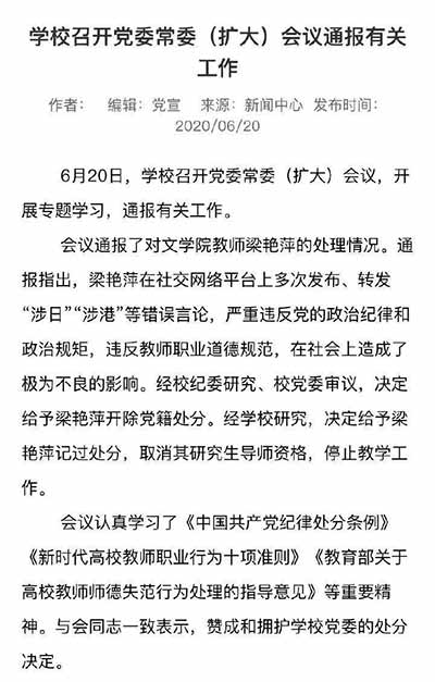 湖北大学中文教授梁艳萍的处理结果出来了,梁艳萍因在社交平台上多次发表“涉日”、“涉港”等言论,被开除党籍、给予记过处分、取消其研究生导师资格,停止教学工作。这个决定虽然是千呼万唤始出来,但我对湖北学校的这个处理结果,还比较满意。