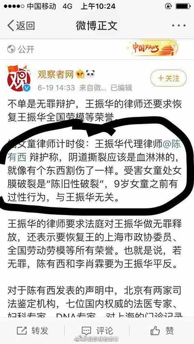 根据被害人的代理律师透露的信息,陈有西在庭审过程中,为了证明王振华无罪,竟然说人家受伤害的九岁小女孩以前有过性行为。
