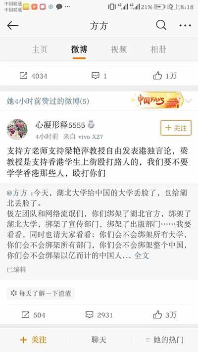陈有西这种自我感觉良好的特点和方方很像。方方也很喜欢攻击反对他的网友低智商,但自己却时不时搞个一般人都不会犯的低级错误。比如,前几天,方方点赞了一个嘲笑她的评论,原因是她可能只看了前面十个字,就以为是支持她迫不及待的点了赞。