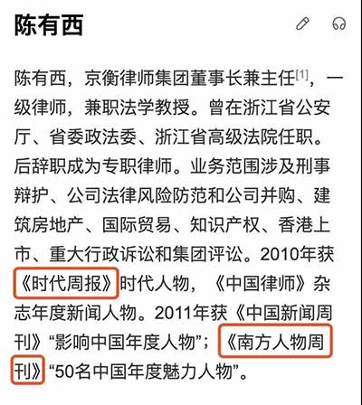 陈有西的名声鹊起,是在前几年公知的高光时段实现的。有那么一段时间,反体制可以得到网络话语权的支持,迅速实现知名度的跃迁。前几年的“死磕”律师,名声大作,陈有西就是从“死磕”获得名气加持,并受益最大的“死磕派”律师之一。