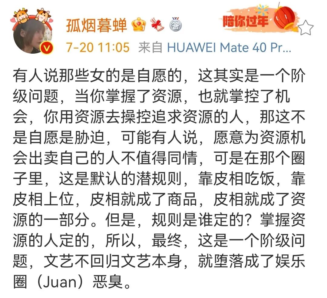 这个道理,现在,是某粉红大V都懂得了的!她说:“有人说那些女的是自愿的,这其实是一个阶级问题,当你掌握了资源,也就掌控了机会,你用资源去操控追求资源的人,那这不是自愿是胁迫,可能有人说,愿意为资源机会出卖自己的人不值得同情,可是在那个圈子里,这是默认的潜规则,靠皮相吃饭,靠皮相上位,皮相就成了商品,皮相就成了资源的一部分。但是,规则是谁定的?掌握资源的人定的,所以,最终,这是一个阶级问题,文艺不回归文艺本身,就堕落成了娱乐圈(Juan)恶臭。”