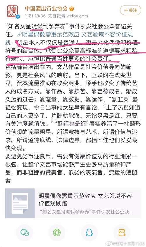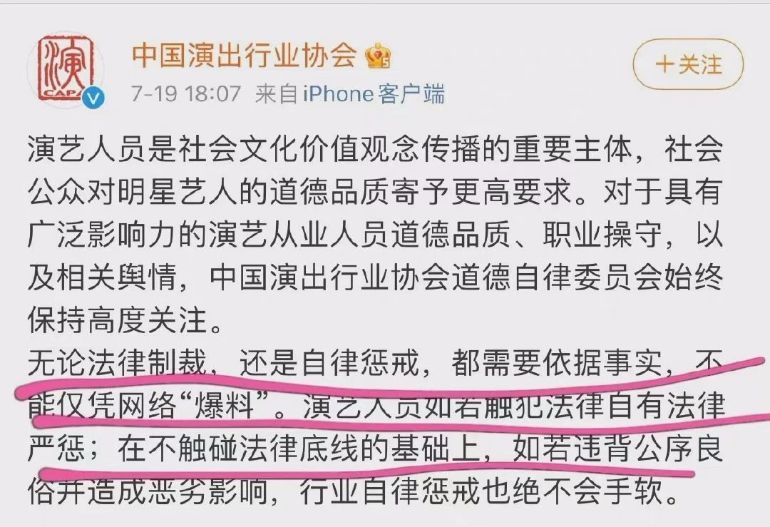 中国演出行业协会也出阿狸发话,虽然演艺人员是社会文化价值观念传播的重要主题,但是,无论法律制裁还是自律惩戒,都不能仅凭网络“爆料”。