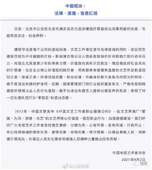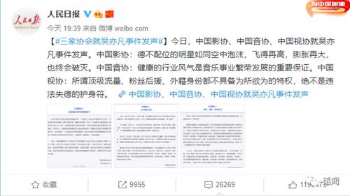 昨天,@人民日报 发帖:【#三家协会就吴亦凡事件发声#】今日,中国影协、中国音协、中国视协就吴亦凡事件发声。中国影协:德不配位的明星如同空中泡沫,飞得再高,膨胀再大,也终会破灭。中国音协:健康的行业风气是音乐事业繁荣发展的重要保证。中国视协:所谓顶级流量、粉丝后援、外籍身份都不具备为所欲为的特权,绝不是违法失德的护身符。