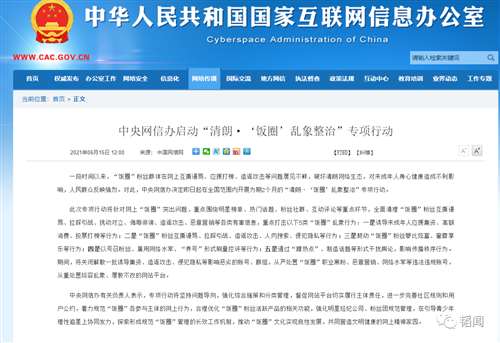 在今年6月15日,中央网信办即在全国范围内开展为期2个月的“清朗·‘饭圈’乱象整治”专项行动。行动中的重点从名称就可以知道,就是所谓的“饭圈文化”。