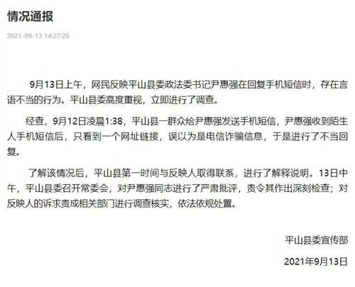 13日下午,官方通报来了,原来是尹书记在一篇长信中只看到一个网址链接,误以为是诈骗短信,此事是个误会。