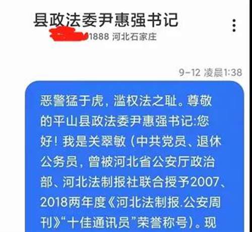 关女士是退休公务员,她在9月12日凌晨通过短信发了一封举报信给平山县政法委书记尹惠强,举报内容触目惊心。