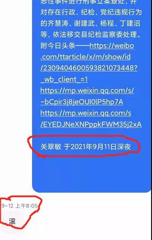 可习惯了举报碰壁的关女士没想到尹书记早上8点多给了她回复,只有一个字:滚。