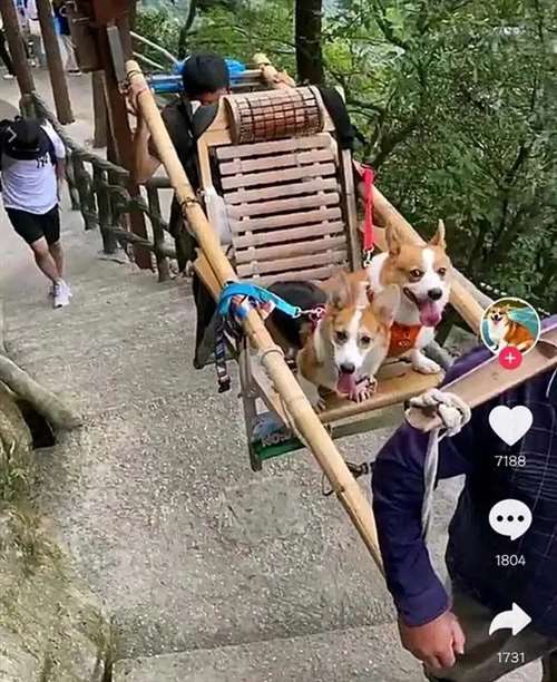 狗坐轿子的视频更像是网红为了吸引流量,特意为自己的狗安排的,ta自己反而在一旁行走跟拍。