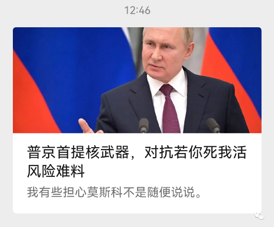 西方对泽连斯基政权的支持正在变得实质性起来。而为应对西方这种强硬,俄国也更加倾向于加强战争的国际性如与白俄罗斯进一步协调;普京在北京时间昨天晚上甚至走到了“首提核武”的地步,这甚至令一些同情俄国的网友都感到震惊——这就不能不使乌克兰危机愈加带有国际性和复杂性。有人说,没有人知道世界大战是怎么打起来的。