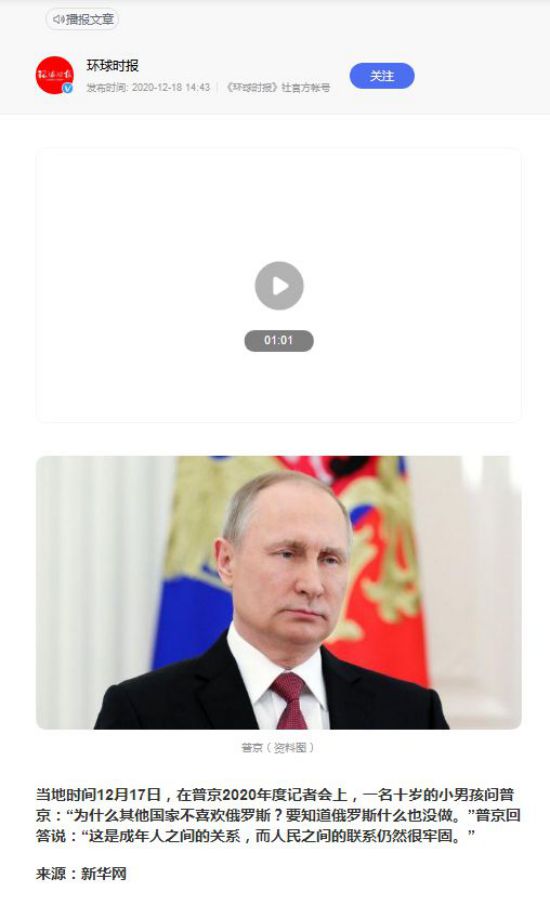 这么重要的消息,居然被漠视了。再搜““为什么别的国家不喜欢俄罗斯?” 普京回答10岁男孩的 “灵魂之问””,环球网上有,点进去看,也被轻描淡写了。