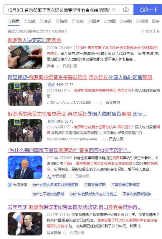 比如搜索“12月8日,普京签署了再次延长俄罗斯养老金冻结期限的总统令”,只有新民晚报有一条结果。处处关注世界其他地区负面消息的环球网和观察家网上都没有。