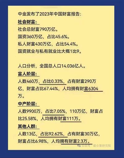 实践是检验真理的唯一标准!邓小平诞辰120周年前夕,中金公司发布2023年中国财富报告显示:中国0.33%的富人阶层财富占比67.44%,92.62%的其他人群财富占比6.98%!对比美国美联储发布的数据,2021年美国1%的富人超过90%美国人的财富总和,而我国是0.33%富人超过92%中国人财富总和的近10倍,并且,多少中国富人的财富转移到了美国?
