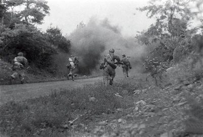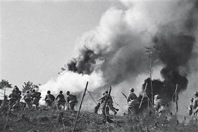 【夏秋防御战役中,担任突击任务的“战斗模范连”战士,在强大的炮火掩护下,穿过铁丝网向敌人发起冲锋】