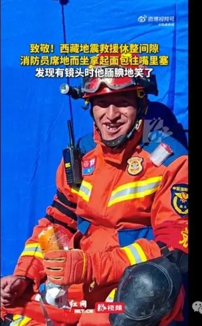 在地震救援休整间隙,消防员就席地而坐拿起面包往嘴里塞,让出热饭热菜给受灾群众。