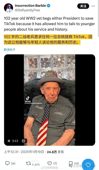 今天,连一位102岁的二战老兵都出来指责拜登政府害他失去了Tiktok。
