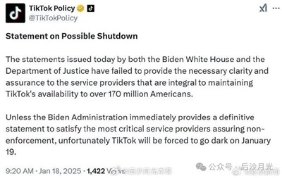 在关停之前,TikTok发布了一份公告:“我们很遗憾,一项封禁TikTok的美国法律将于1月19日生效,并迫使我们暂时停止提供服务。我们正尽快努力在美国恢复我们的服务,我们感谢各位的支持。请保持关注。”