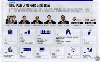 彭博商业周刊曾用一幅图简洁了当地说明李嘉诚等富可敌国的香港“四大家族”是怎样控制700万市民的生老病死。