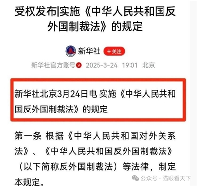 面对美国的极限施压,新华社于3月24日受权发布了关于实施《反国外制裁法》的规定,从3月24日立即生效,根据这个规定,只要对中国的不合理的制裁,尤其是严重危害中国国家安全的制裁行为,中国将依法予以包括冻结在华资产、列入不可体清单等在内的措施予以坚决反制。