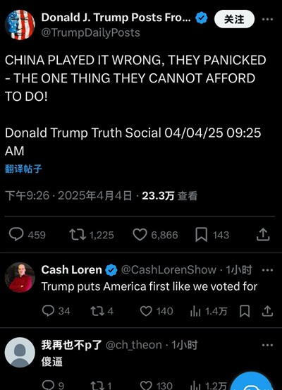 特朗普明显也没想到中国反馈速度这么快,也没想到中国反击力度这么大,社交媒体上回复的语气,颇有些不自信。