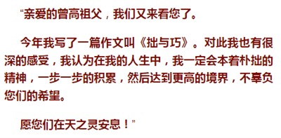 在曾高祖父,也就是父亲爷爷的爷爷墓前,毛甜懿的追思语: