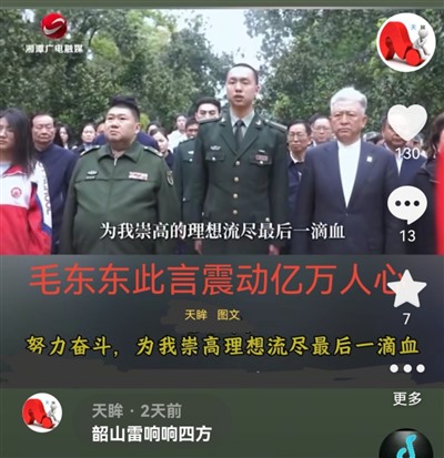韶山冲的一些村民们说:“看见他就好像看见了毛主席。”网上无数的网民看到毛东东隔屏传递出的强烈情热与祟高志向,无不为之感染。不少人在转发这个视频的时候特意配上情深意长的红歌《浏阳河》“浏阳河,弯过了九道湾,五十里水路到湘江,江边有个湘潭县哪,出了个毛主席,领导人民得解放……”当我听到歌中江水滔滔流不尽,脑海里就闪出高大威武,颇有青年毛泽东神采的毛东东,他是共产主义接班人的榜样,此时此刻,耳畔响起穿跃时空的《少年先锋队队歌》“沿着革命前辈的光荣路程,时刻准备建立功勋……为理想勇敢前进!”写到此处,我们完全有理由期待。