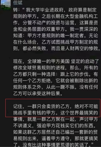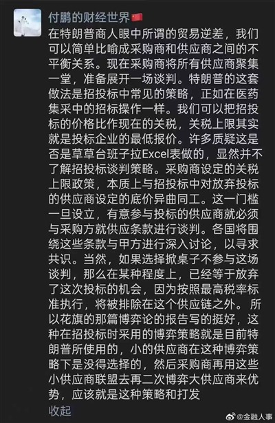 原因也不复杂,毕竟特朗普搞的这些抽象事情确实让全世界鸡飞狗跳,绝大部分国家没能力反击,但不代表不希望有人站出来反击。从观察来看,恐怕全世界最不希望有人反击的就是我国的某些金融界人士和“经济学家”了。