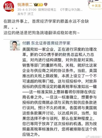 在特朗普选择用关税进行“万国宣战”之后,我国对从美国进口的所有商品施加了同样的反制关税,这样的反制规模和速度超出了全球所有财经媒体的预料。不出意外的,我国的一些投资人、金融人士和自诩的“经济学家”又开始阴阳怪气,不知所云——大家恐怕必须承认,预料到这些人的姿势实在是太容易了,这不是什么“刻板印象”能解释的。(本文并非针对国内正经的经济学研究者们,没办法,现在挂着“经济学家”头衔出来搞风搞雨的投资和投机人士太多)