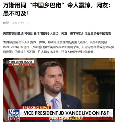 近日,美国副总统万斯在一次接受采访中,以傲慢至极的态度把中国蔑称为“中国乡巴佬”(Chinese peasants)万斯在发言上说,全球主义经济到底给美国带来了什么,说到底,它靠两个基本套路在运转,美国背上巨额债务,去买别的国家替我们生产的产品,更直白点说,我们向“中国农民”借钱,再买他们生产的产品……