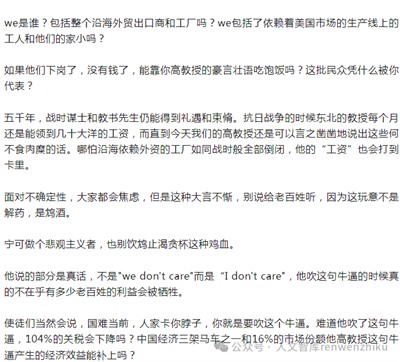 “听着这豪言,我有以下问题:WE是谁?包括带领沿海外贸易出口商和工厂吗?WE包括依赖着美国市场的生产线上的工人和他们的家小吗?如果他们下岗了,没有钱了,能靠你高教授的豪言壮语吃饱饭吗?这批民众凭什么被你代表?”