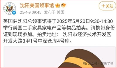 中国也受到波及。4月9日,美国驻沈阳总领馆发了微博,表示将在5月份举行美国二手家具家电产品拍卖会,看来要被裁撤了。不过我觉得这是好事,最好把驻香港的总领馆也裁了。