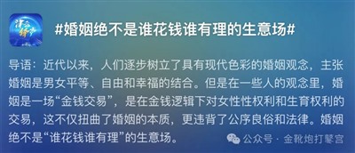 其实之前写过太多关于性别话题的文字,性别对立的核心缘由是私有制的死灰复燃,也正是因为私有制的价值观大行其道,从而固化了“谁出钱 谁大爷”的思维,可是如今却又反向声称#婚姻绝不是谁花钱谁有理的生意场# 那么群众要问一句了:到底该咋着?这婚姻制度到底姓社还是姓资,能不能给个准话?
