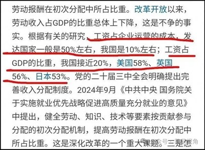 2024年,北京大学经济学院在一份报告中指出:改革开放以来,我国的劳动收入占GDP的比重总体上呈下降趋势。根据相关研究,工资占企业运营的成本,发达国家一般在50%左右,我国在10%左右。