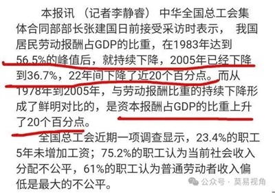 北京大学的这份报告,同中国日报之前的报道相吻合。报道指出,我国居民劳动报酬占GDP的比重,在1983年达到56.5%的峰值后就持续下降,2005年已经下降到36.7%,22年间下降了近20个百分点。而2005年以后的20年间,这一比重又进一步下降了约十几个百分点。