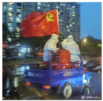 2021年夏天“723动车事故”十周年时,当时的河南郑州与江苏南京——两个同时段与雨灾、疫情搏斗的城市,纷纷竖起了那面熟悉的旗帜:
