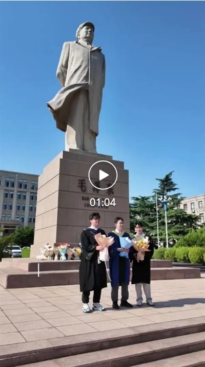 不止于此。大连理工大学主楼前,毕业典礼仪式结束后,或学生和家长、或同学和同学,都不约而同的一起向毛主席敬献鲜花,以表明捍卫和感恩毛主席的坚定态度。此情此境,真可谓“最高境界的毕业致辞”↓