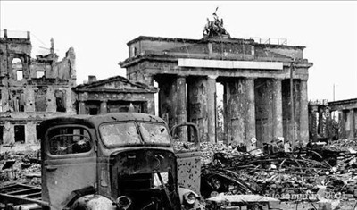 曾经是德意志民族胜利象征的勃兰登堡门被炸成一片废墟