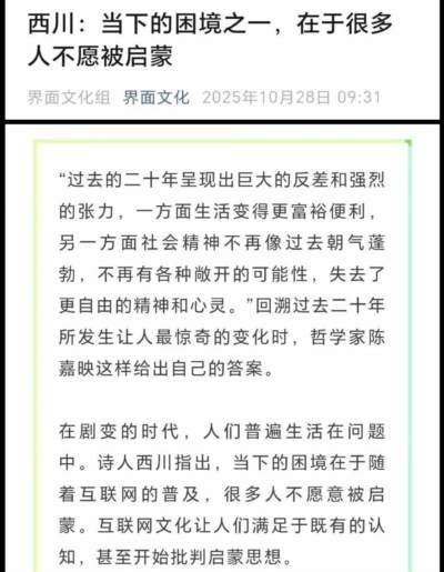 比如某家媒体在2025年10月28日发布报道,称“当下的困境之一,在于很多不不愿被启蒙。”