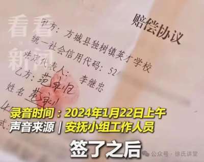 遇难学生家属范先生介绍,事故发生次日,他搭乘航班从外地赶回老家,刚下飞机就被专门的安抚小组接到了方城县的一家宾馆。当时他满心焦灼,唯一的念头就是尽快见到孩子,可没想到,等待他的不是孩子的消息,而是一份赔偿协议。这份协议的甲方为方城县独树镇英才学校,乙方为遇难学生家属。
