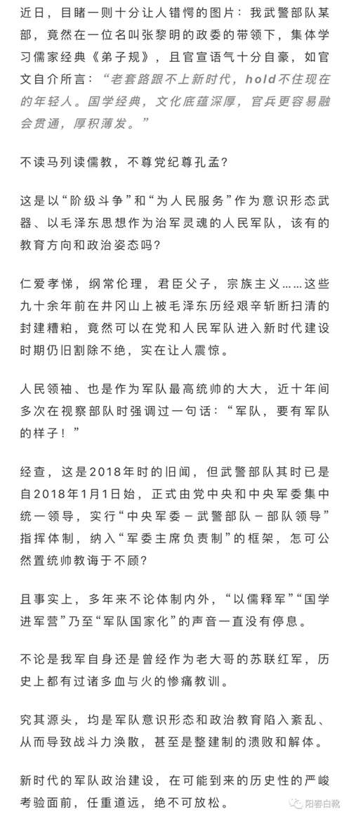 千万不要觉得杞人忧天,我开篇即述,多年来不论体制内外,“以儒释军”“国学进军营”乃至“军队国家化”的声音一直没有停息。