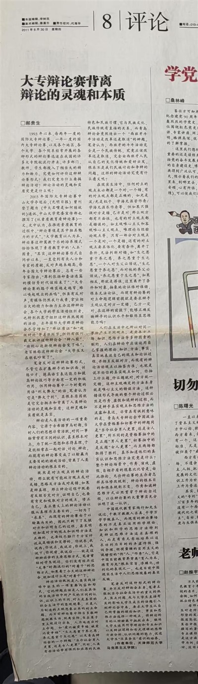 【笔者按】目前在思想意识形态领域里斗争十分尖锐激烈。当今人们几乎对意识社会问题特别是重大的理论和现实问题都有不同认识甚至是根本对立的认识。按照辩证唯物主义的认识论,人们通过讨论、争论、辩论、反驳确实是解决分歧、批判错误、获得真理的一种极其重要的途径和方法。但是讨论和争论、争辩不同的观点时要遵循一定的逻辑规则。但是笔者发现现实生活中人们对不同理论和现实问题的争论、争辩过程中,违反形式逻辑、辩证逻辑的现象比比皆是。如偷换概念、制造虚假的大小前提,毫无内在逻辑联系的主观主义的推论等等诡辩现象极其之多。相当多的权力者和学者包括知名学者的论文、著作中的逻辑错误极其之多。近举一列,中国共产党人搞了100多年的社会主义理论,竟然在什么是科学社会主义的本质问题陷入了混乱。在某些权力者和学者的概念和推论过程中,逻辑错误非常之多。这是造成当前意识形态领域里真理与谬误的对立极其混乱的重要原因之一。上世纪末到本世纪初的20多年时间里,流行于亚洲特别是是国内大专院校的所谓“辩论赛”其实就是中国当代社会缺乏科学思维、逻辑混乱、诡辩现象猖獗的集中和典型表现。笔者在这种“辩论赛”兴起时,就始终关注。2011年,针对这种“辩论赛”的错误实质写了一篇文章《辩论活动的灵魂和实质究竟是什么?》。当年中国社会科学院主办的《中国社会科学报》6月30日第8版刊载了拙文,标题改为《大专辩论赛背离辩论的灵魂和实质》,个别文字做了修改。2010年之前,中央电视台经常组织和实况转变这种大专辩论会,不知是否与笔者这篇文章有关,自2011年之后,中央电视台就再也没有组织和转播这种辩论赛活动。今日笔者将这篇拙文在网上重新发表。供各位网友学习参考,并对对照社会现实,认识现实中的论辩现象中的逻辑错误和诡辩实质,提高人们科学思维的极其重要性。也欢迎网友对拙文批评指正。