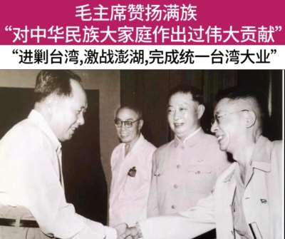 2,1960年4月,毛主席高度赞扬满族,肯定清朝时满族的历史功绩,毛主席说:“满族是个了不起的民族,对中华民族大家庭作出过伟大贡献,特别是康熙皇帝三征噶尔丹,牢牢守住新疆;进兵西藏,打败占扰西藏的准噶尔部,维护了西南边疆统一;进剿台湾、激战澎湖,完成统一台湾大业;收复东北雅克萨、签订中俄《尼布楚条约》,巩固了东北边疆,在帝国主义侵略之前,砥定了我们国家所拥有的领土和版图。”(来源:国家民族事务委员会官网)