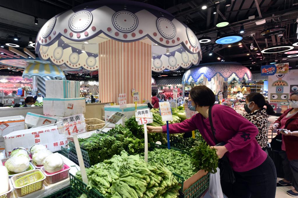 2022年1月4日,市民在友爱街市选购蔬菜。香港屯门友爱街市是一家设计风格富有特色的街市,无论是外观还是内部装修,走进街市仿佛进入童话世界。(新华社记者 卢炳辉 摄)