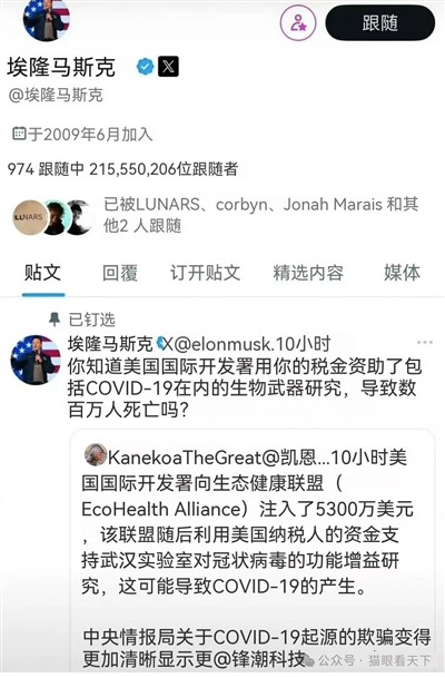 继续说马斯克的这篇转帖。他说该组织花费巨资资助了包括新冠病毒在内的生物武器研发并杀害了数百万人,到底他们资助了谁?国内某些媒体并没有提及,更像是在刻意回避。这让很多人误以为马斯克只是在单纯的攻击美国的一个组织,但仔细看马斯克这一评论是在转发另一个账号时作的评论,原帖又是怎么说的?这才是最关键的。看一下翻译后的截图。