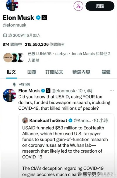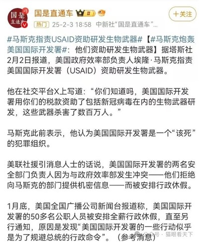 近日,一条广泛在网络自媒体传播新闻引发了越来越多网友们的关注,大概内容是马斯克公开发帖指责美国国际开发署资助研发包括新冠病毒在内的生物武器。