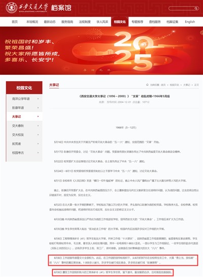 根据西安交通大学档案馆《〈西安交通大学大事记(1896~2000)〉“文革”动乱时期·1966年5月后》: